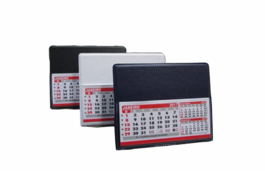 Calendário de Mesa em PVC Laminado e Papelão com visor transparente. Vendido em pacotes de 100 unidades de cada cor. Disponível nas medidas: 21cmX12,5cm e 26,4cmX16,5cm.