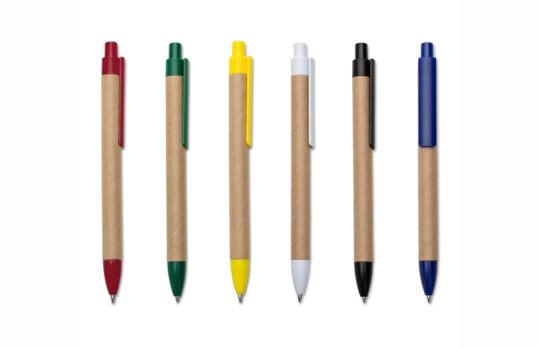 Caneta ecológica de papelão com detalhes coloridos. Além do amplo espaço para personalização no clip, o mesmo pode facilmente ser retirado para personalização no corpo da caneta. Clip e ponteira plástica, aciona por clique. Largura : 1,4 cm Comprimento : 13,9 cm Peso aproximado (g): 6