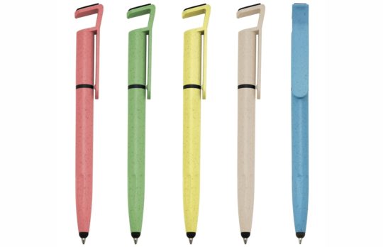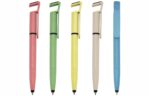 Caneta fibra de bambu touch com suporte para celular. Clip aberto utilizado como suporte para o celular e parte superior com limpador de tela. Aciona por giro, carga esferográfica na cor azul. Largura :  1,8 cm Comprimento :  14,7 cm Peso aproximado (g):  12