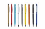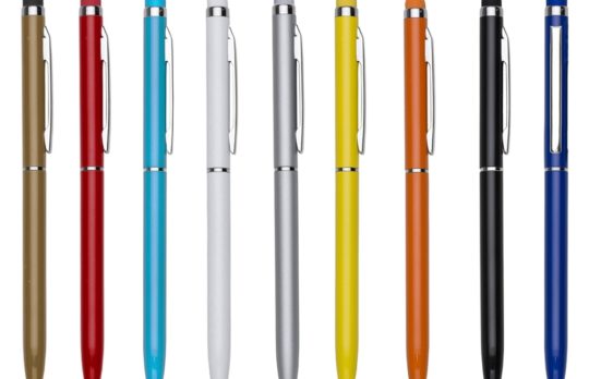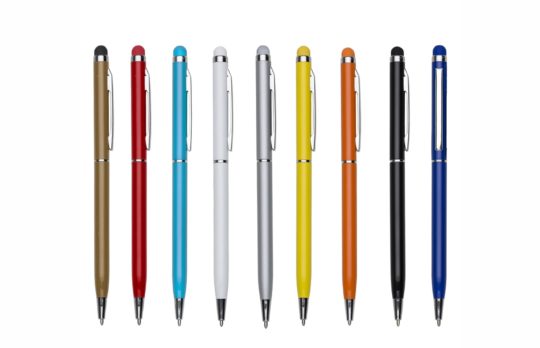 Caneta metal fina com ponteira touch. Corpo colorido com clip e anel central prata, possui borracha touch na cor da caneta. Aciona por giro. Tamanho total aproximado (CxL): 13,6 cm x 1 cm Peso aproximado (g): 11