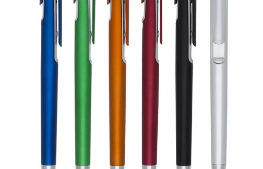 Caneta plástica inteira colorida com detalhes em prata. Possui um clip com design espaçoso ideal para gravação, aciona por clique. Tamanho total aproximado  (CxL):  14 cm x 1,3 cm Peso aproximado (g):  8