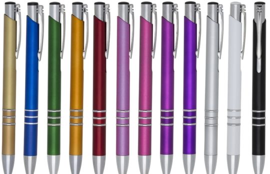 Caneta plástica inteira colorida com detalhes em prata. Ponta do acionador preto e clip metal, possui 3 anéis inferiores. Aciona por clique. Altura : 13,9 cm Largura : 1,4 cm Peso aproximado (g): 9