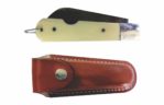 Lâmina em aço inox e cabo em pau-brasil. Personalização a laser no cabo e em relevo na bainha. Medidas: 11 cm