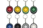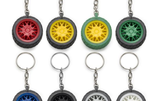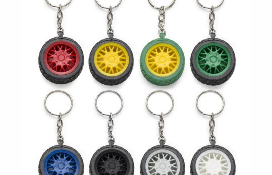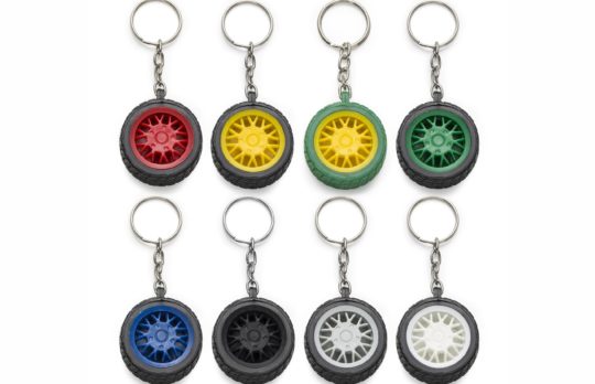 Chaveiro plástico formato pneu, aro detalhado plástico colorido de um lado e lado inverso liso(possível aplicar resina). Pneu emborrachado. Tamanho total aproximado (CxL): 9,7 cm x 4 cm x 1,5 cm Peso aproximado (g): 20