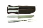 Conjunto artesanal com lâmina em aço inox e garfo, personalização à laser na lâmina e em relevo na bainha.