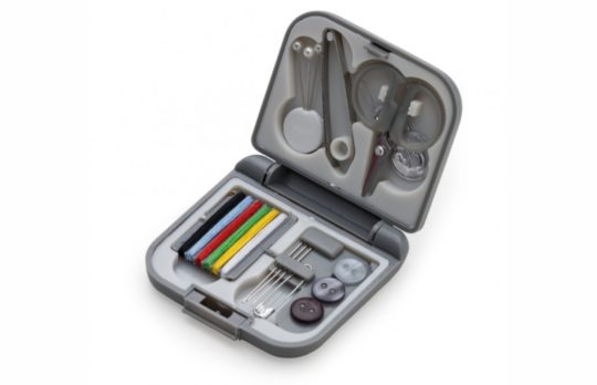 Kit costura de plástico resistente, possui frente e verso liso fosco e parte interna com suporte plástico para os itens. Possui três alfinetes de pérola, pinça, mini tesoura, passador de linha, conjunto com 6 linhas coloridas, três agulhas, alfinete de gancho e três botões. Tamanho total aproximado (CxL): 6,9 cm x 7 cm Peso aproximado (g): 39