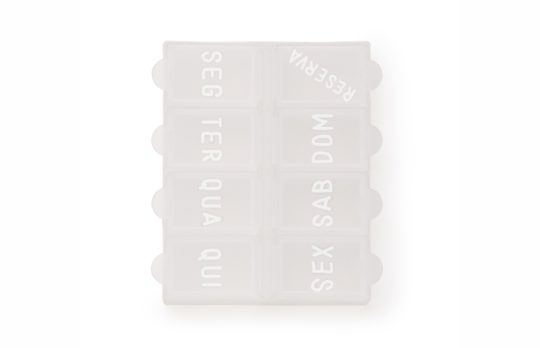 Porta comprimidos semanal de plástico branco fosco. Possui oito divisórias, sete delas escrito em relevo os dias da semana e a última escrito “reserva”. Verso liso. Tamanho total aproximado (CxL): 6,8 cm x 7,6 cm Peso aproximado (g): 19
