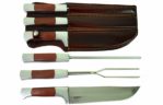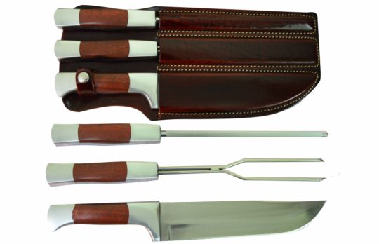 Conjunto artesanal com lâmina em aço inox, garfo e chaira. Personalização à laser na lâmina e em relevo na bainha.
